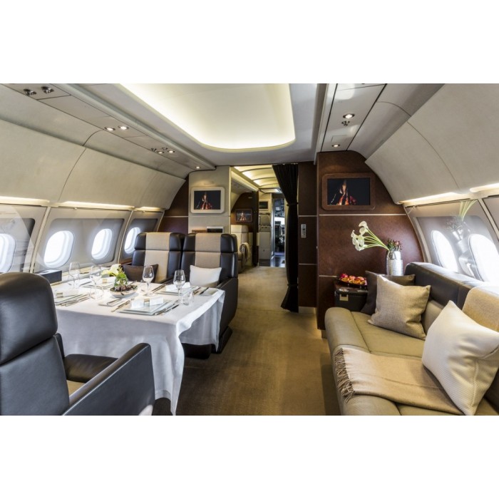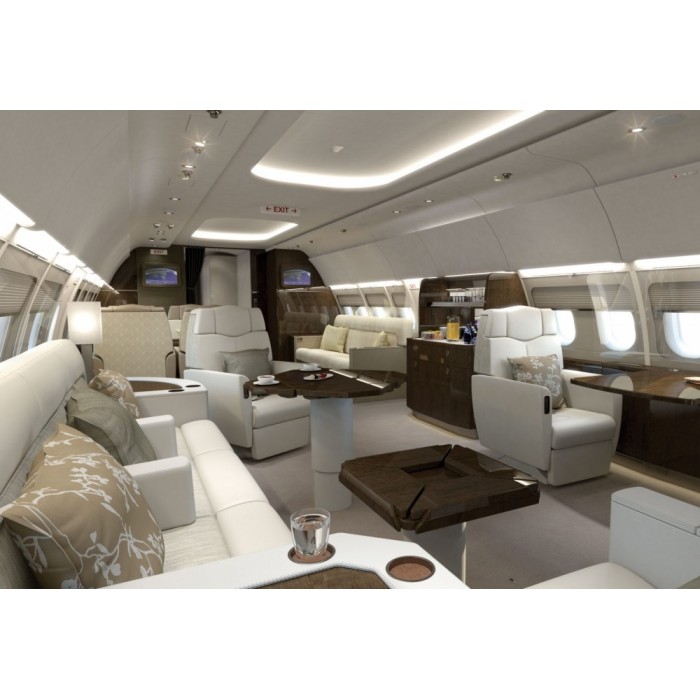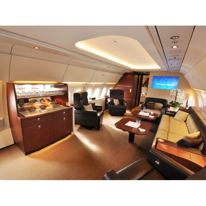 Действительно широкий салон (75 м² — что соответствует площади современной комфортабельной 2-х комнатной квартиры) представляет собой офисное пространство, оборудованное несколькими рабочими столами и столом для переговоров, кожаными креслами и диванами, проектором и большим LCD-телевизором. Прямо во время полёта можно провести бизнес-презентацию или совещание относительно будущей стратегии компании. Также имеется бар для отдыха.