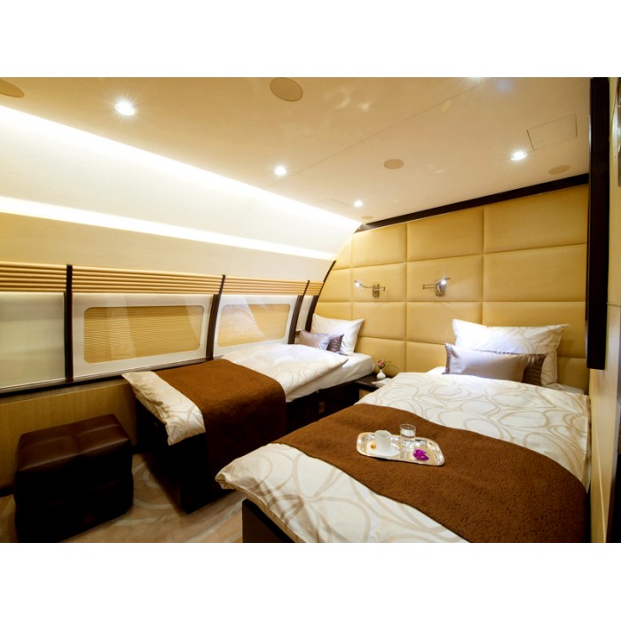 Любителям крепкого сна в полёте лайнер предлагает спальную комнату с рассеянным, мягким освещением, ароматерапией, улучшенной звукоизоляцией и полноценной двуспальной кроватью.