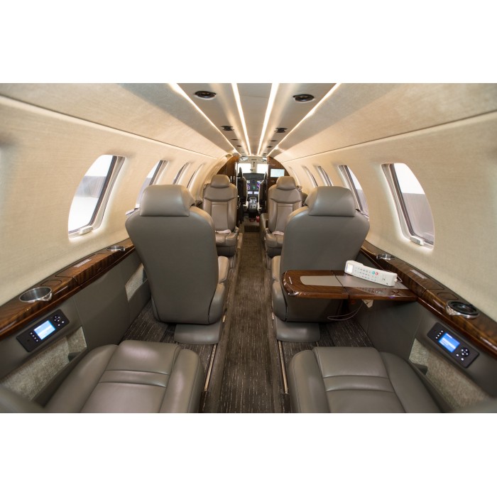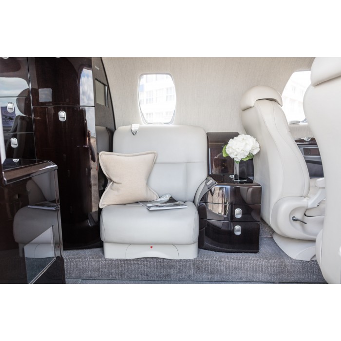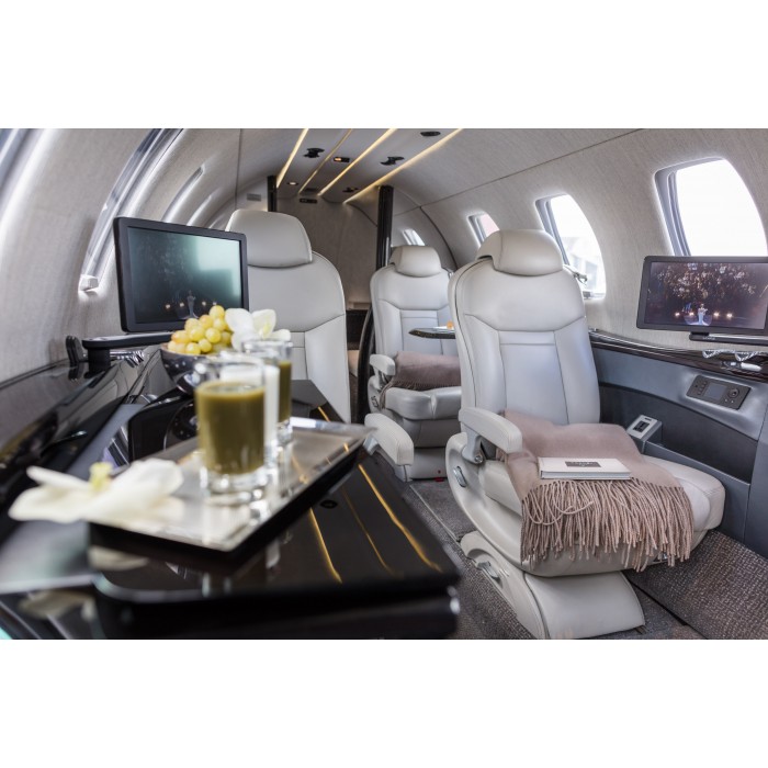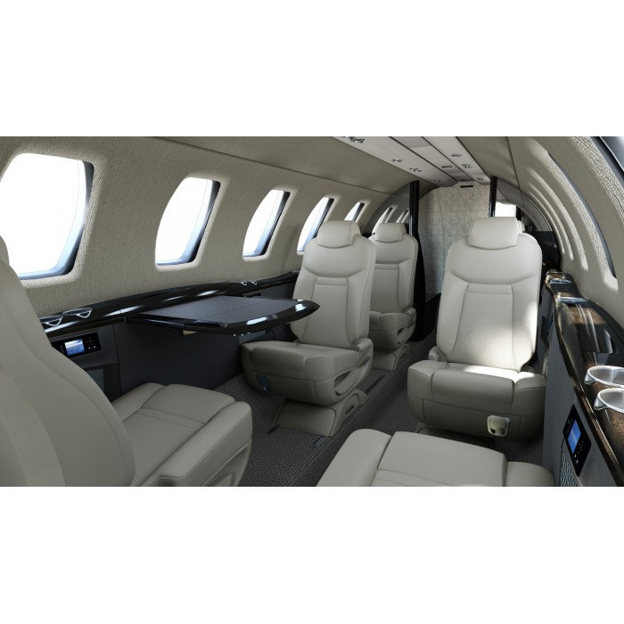 Интерьер самолёта довольно красивый. Внутренняя отделка и эксклюзивные сиденья создают приятную обстановку. В заднем отсеке расположена клубная секция из четырёх кресел, плюс два кресла лицом по направлению полета. В стандартной компоновке напротив входной двери находится седьмое пассажирское кресло. Пол в проходе утоплен с целью увеличения высоты салона.