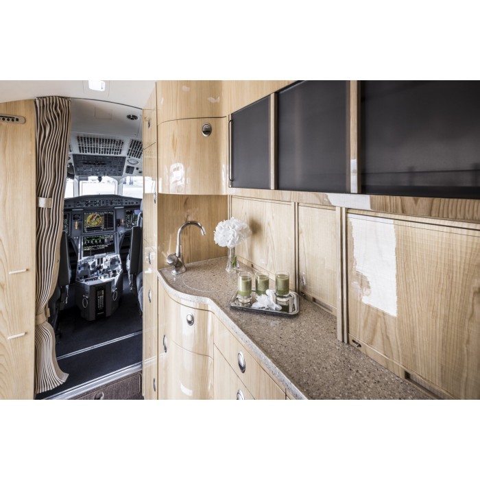 Салон бизнес-джета отличается особой французской изысканностью. Отделка — только ценными породами древесины и высококачественными материалами. Высота 1,88 м позволяет передвигаться в полный рост даже очень высокому человеку. Комфортабельные кресла, расположенные напротив друг друга, трансформируются в полноценные спальные места. При желании кресла можно трансформировать в две односпальные кровати и одну «King Size». Просторный салон и бесшумность полёта потворствуют плодотворной работе и комплексному отдыху.
