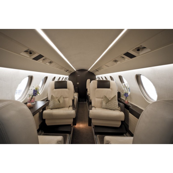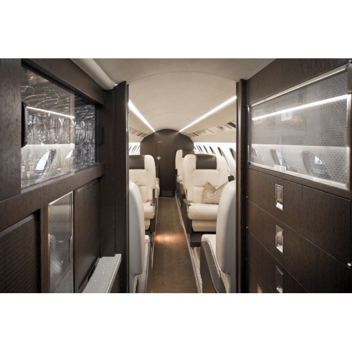 VIP-салон самолета имеет два отделения и рассчитан на 8-9 человек. Отсек в хвостовой части оборудован угловым диваном и креслом. В этой части салона, благодаря расположению мебели и размещению пассажиров лицом друг к другу, складывается уютная домашняя атмосфера. Вторая часть салона самолета имеет более строгую обстановку: четыре кресла и столы между ними располагают к ведению деловых переговоров или проведению совещаний в узком кругу.